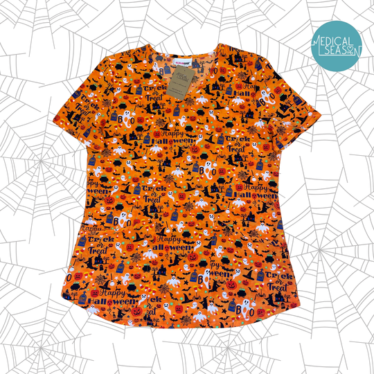 Top "Halloween Naranja" Reciclado. Marca: Scrubstar Talla: 3XL Medidas Busto: 142 cm Cintura: 138 cm Cadera: 150 cm Largo: 75 cmPrecio regular $12.000